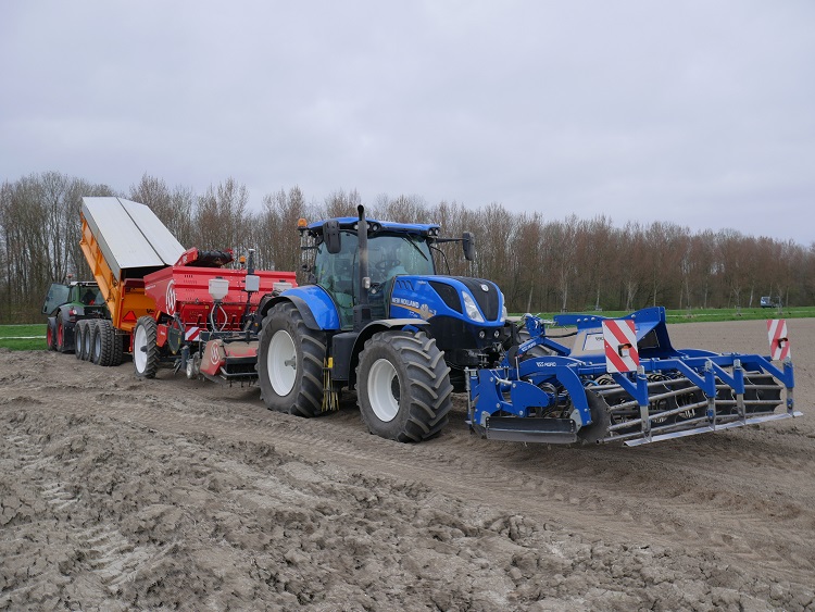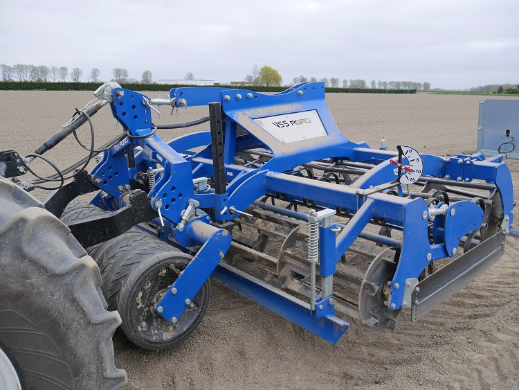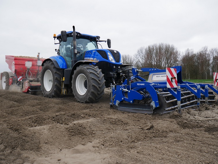 Schlepers heeft de planter uitgerust met een portaaldissel zodat de grondbewerking en het poten in één werkgang mogelijk is. De aardappelen worden in onbereden land geplant. Met de banden op 0,5 bar en een frees die met 20 centimeter diepgang een mooi volume aan losse grond maakt, voert de combinatie met een snelheid van 4,5 km/h het frezen en poten in één werkgang uit.