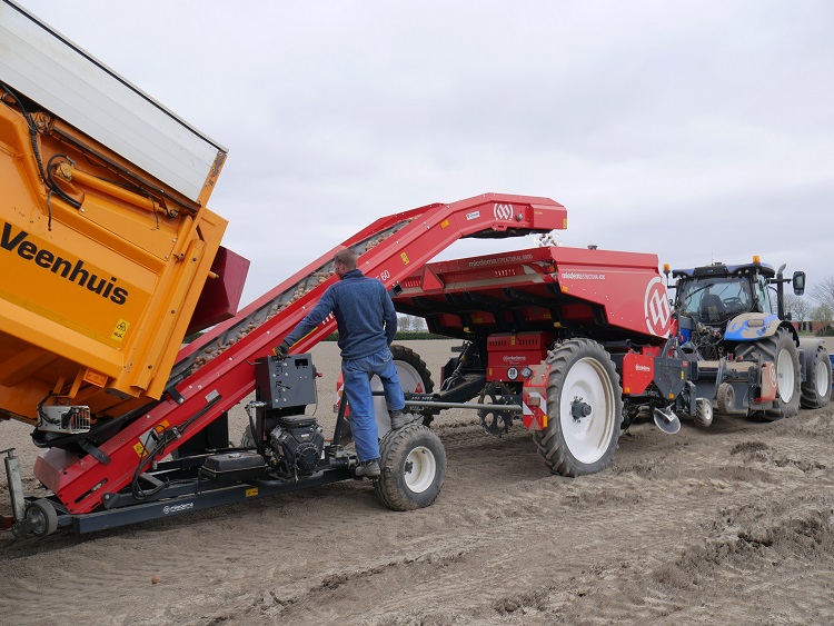 De machine heeft een bunkercapaciteit van vier ton. Daarmee kun je meerdere gangen doorrijden zonder laadtijd. Het vullen gaat snel met de Miedema ME 60 transportband die Schlepers hydraulisch bedient met behulp van een opgebouwde aggregaat. Voor één man is een plantcapaciteit van 10 hectare per dag met deze poot-frees combinatie haalbaar.