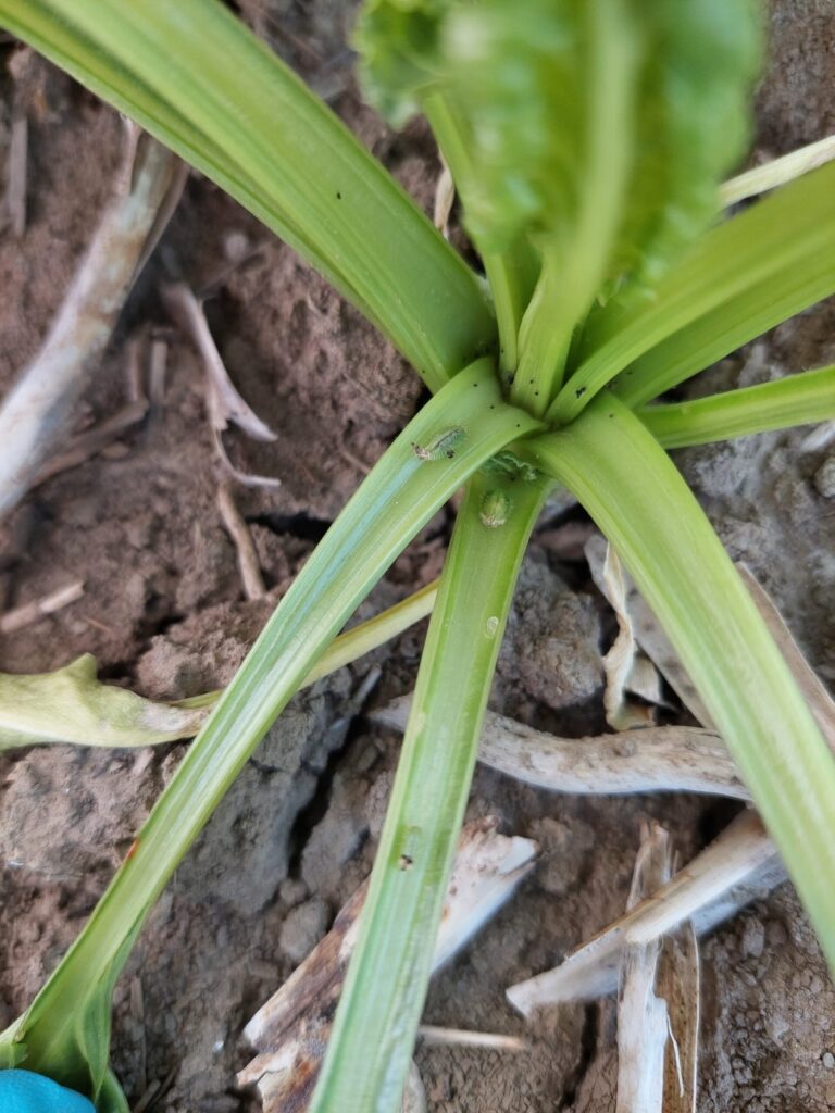 Ingrijpen is dan ook niet nodig. In dit IRS-bericht vindt u foto’s van de schildpadtorretjes, hun eieren en larven als hulp om ze te herkennen. Op onderstaande foto’s staat het schadebeeld wat momenteel veel is gezien, vooral op de kopakkers.
