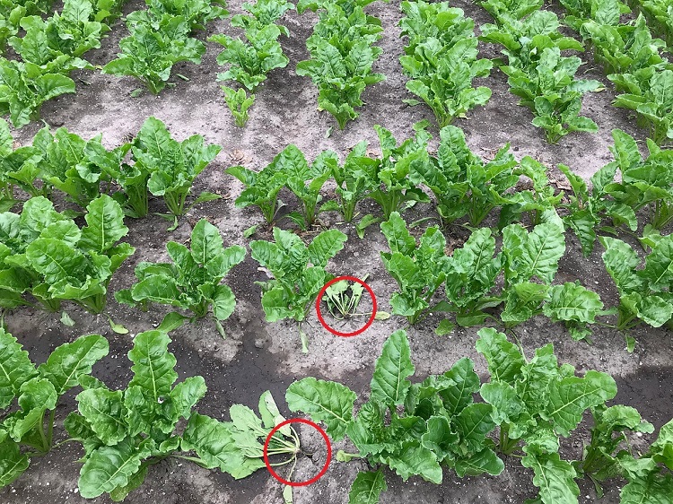 Bij IRS diagnostiek zien ze een toename van afdraaiers. Dit zijn bietenplanten die een ingesnoerde wortel hebben. Die insnoering kan zo erg worden dat de wortel afbreekt, oftewel ‘afdraait’. Hierdoor vallen er planten weg.