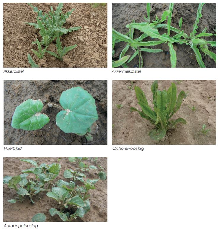 Tegen meerjarige onkruiden zoals distels en opslag van cichorei en witlof kan ook één toepassing van 1,2 L/ha plus olie worden uitgevoerd. Pas deze toe op gezond groeiende onkruiden liefst in het 8-10 blad stadium, maar nog wel voor de bloei. Ook weer niet te laat, anders staan de onkruiden onder de bietenplanten en is de bedekking onvoldoende.