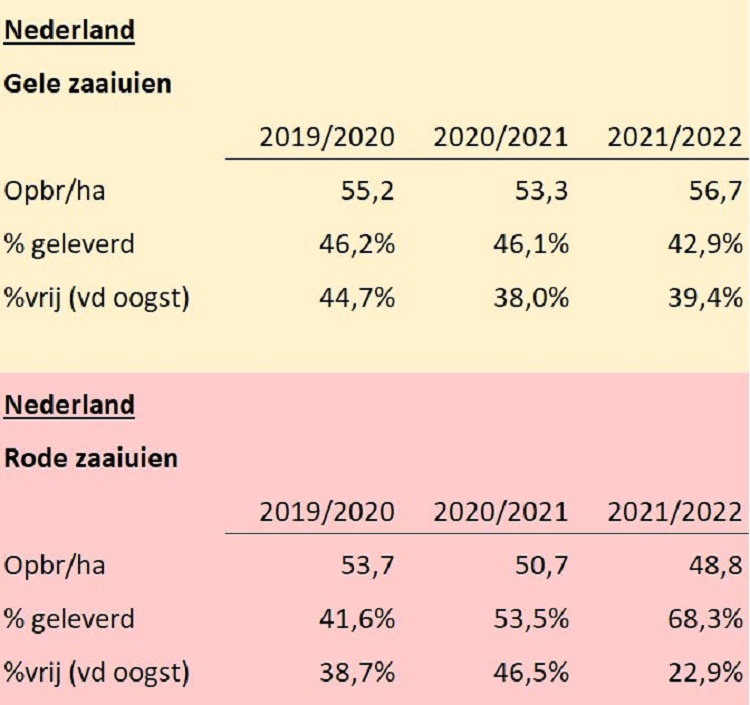 Het volume wat afgeleverd is door de deelnemers aan de voorraadinventarisatie omvat circa 51 procent van de oogst. In absolute tonnen is er 13,3 procent meer afgeleverd dan vorig seizoen. Bij de rode uien ligt het percentage geleverd flink hoger dan in de afgelopen jaren. Hiervan is 68,3 procent afgeleverd, terwijl dit vorig seizoen op 53,5 procent lag. Bij de gele uien ligt het percentage wat afgeleverd is iets lager.