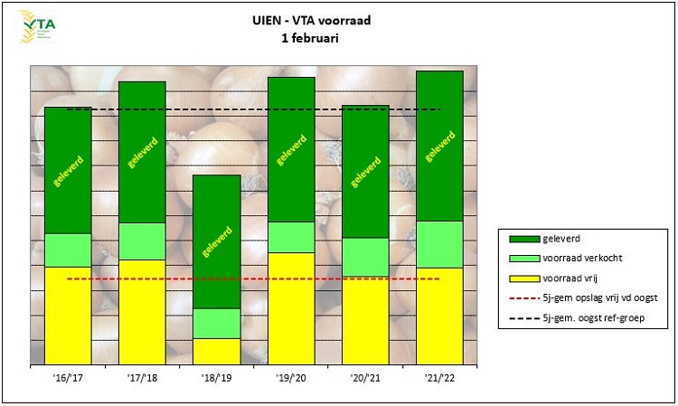 Uit de voorraadinventarisatie die VTA in de afgelopen weken onder haar leden heeft uitgevoerd kan zijn geconcludeerd, dat de uienmarkt een inhaalslag heeft gemaakt ten opzichte van december. De vrije voorraad is inmiddels lager dan het langjarig gemiddelde, waarbij vooral bij de rode uien een flink gat is geslagen.