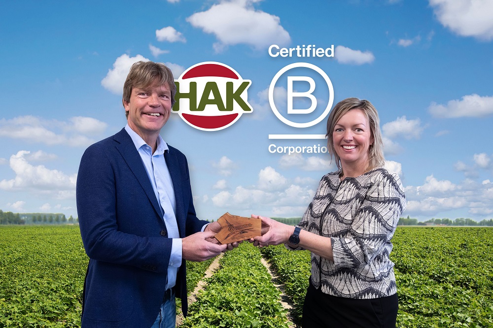 Timo Hoogeboom, CEO van HAK, nam deze week de B Corp certificering in ontvangst uit handen van Tessa van Soest, directeur van B Lab Benelux, de non-profitorganisatie achter de certificering. Daarmee mag Neerlands Glorie Groente en Fruit, waar HAK onderdeel van is, zich officieel een B Corporation noemen: een gecertificeerd bedrijf dat zich inzet voor een betere wereld, met oog voor mens, milieu en maatschappij. Hiermee krijgt HAK toegang tot de ‘B Corp community’, een netwerk van gelijkgestemde bedrijven dat kennis, inzicht en inspiratie biedt, met onder meer benchmarks en events.