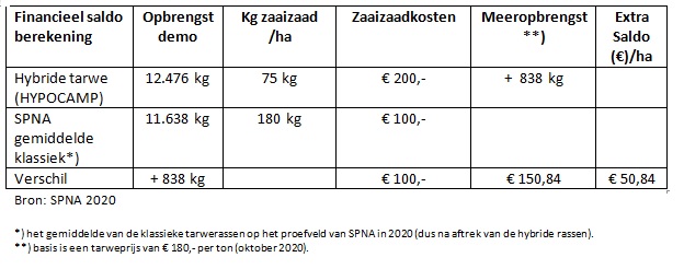 De meeropbrengst ten opzichte van klassieke tarwe is in feite de bonus op de investering die met het duurdere hybride tarwe zaaizaad gepaard gaat.