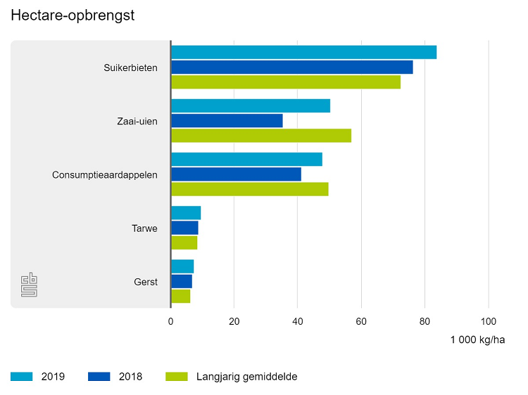 Nederlandse akkerbouwers behaalden in 2019 per hectare recordopbrengsten aan de graansoorten tarwe en gerst. Er werd vorig jaar gemiddeld 9,6 ton per hectare aan tarwe geoogst, 9 procent meer dan het jaar daarvoor, en meer dan een ton boven het langjarig gemiddelde.