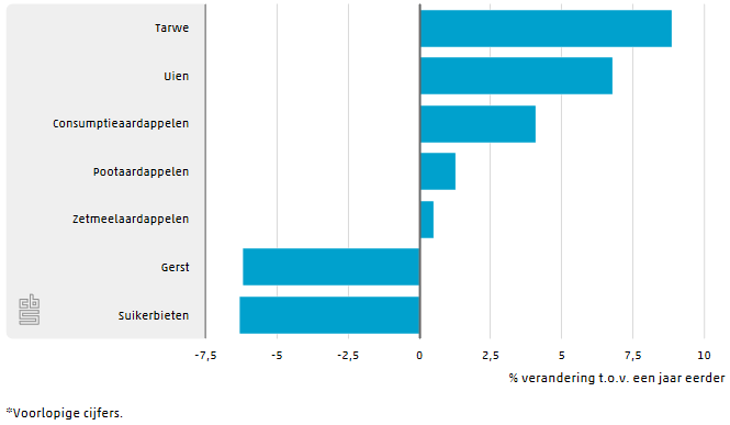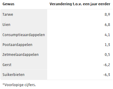 De teelt van tarwe, uien en aardappelen is in 2019 toegenomen. De arealen tarwe en uien zijn vergeleken met een jaar eerder met bijna 9 en 7 procent gegroeid. Het areaal aardappelen werd in een jaar tijd met ruim 2 procent uitgebreid. De teelt van gerst en suikerbieten neemt tegelijkertijd af. Dit blijkt uit de voorlopige uitkomsten van de Landbouwtelling 2019 van het CBS.