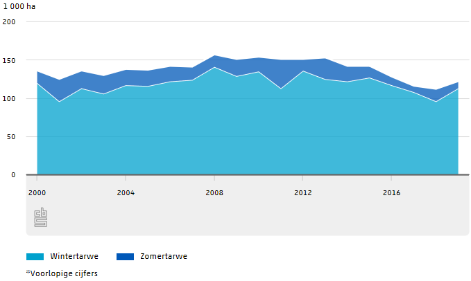 Na jaren van afname is dit jaar een stijging te zien in de teelt van tarwe. Ten opzichte van 2018 is het areaal gegroeid tot 122 duizend hectare, een toename van 8,9 procent. De omvang is echter nog wel een stuk kleiner dan het langjarig gemiddelde. Gemiddeld werd er sinds het jaar 2000 jaarlijks op 135 duizend hectare tarwe verbouwd.