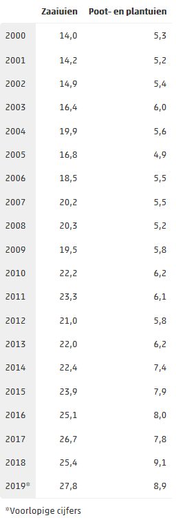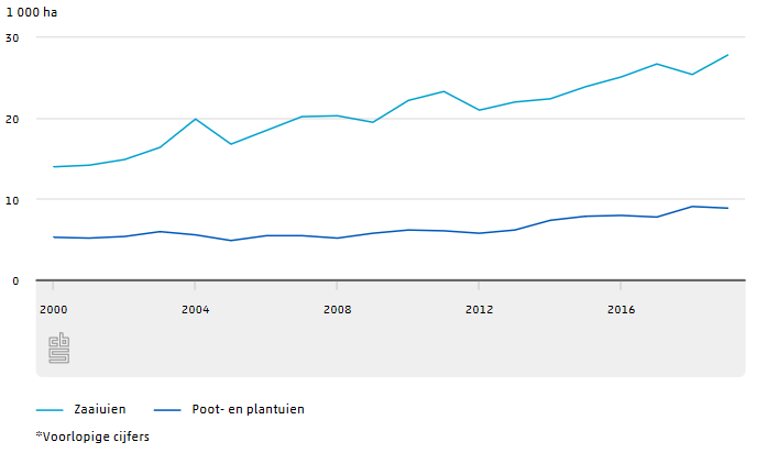 Het areaal zaaiuien neemt in 2019 met bijna 10 procent toe vergeleken met een jaar eerder. Het areaal komt daarmee op een recordomvang van bijna 28 duizend hectare. Ten opzichte van het jaar 2000 is dat een verdubbeling van de teelt.