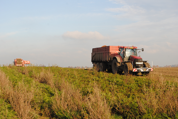 De trekker gaat na de zaaiwerkzaamheden vlot het veld in om erwten na het dorsen in grote opleggers te drukken. In het najaar is de Case één van de schakels in het transport van de geoogste wortelen. Jan Nas prijst zich gelukkig met het kwartet Case Puma’s in zijn machinepark. “De vier trekkers zijn allemaal van hetzelfde type. Met elfduizend, tienduizend en achtduizend hebben de net wat nieuwere machines ook al best veel uren gelopen.”