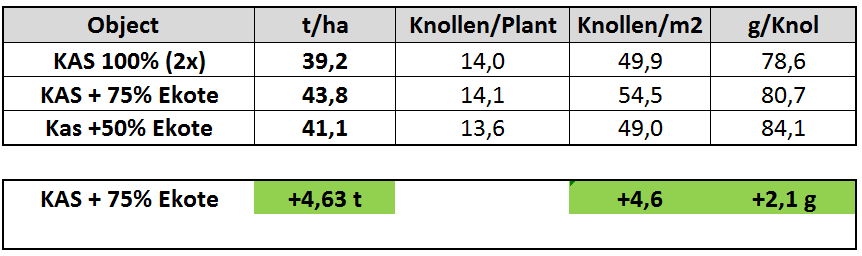 Een derde veldproef betrof pootgoed bij een Duitse akkerbouwer die op zandgrond teelt. Op de rooidatum 15 september 2018 behaalde het Ekote-object tien procent meeropbrengst ten opzichte van de standaard. Ook de Duitse teler zag duidelijke verschillen: “Het gebruik van Ekote leverde mij een beter financieel resultaat op en een sterke vermindering van potentiële N-verliezen door uitspoeling of vervluchtiging”, zo liet hij optekenen na de veldproef met het pootgoed-ras Pelikan.