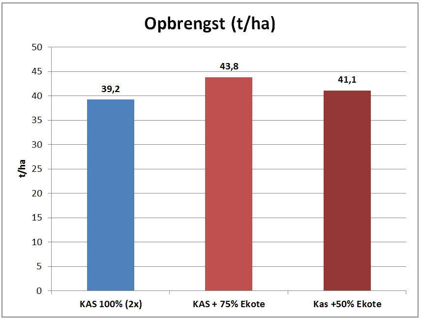 De proef had naast de droogte ook te maken met een overbemesting. Maar omdat dit op alle plots was gedaan, kunnen de resultaten nog altijd goed vergeleken worden. In het groeiseizoen waren er geen grote verschillen te constateren met de andere demovelden. Bij de proef rooiingen kwamen er wel verschillen naar voren. De opbrengstmeter op de rooier gaf ruim 68 ton per hectare aan bij de demo waar Ekote was toegepast. Demo drie en het gangbare veld kwamen respectievelijk uit op 59 en 57 ton per hectare.