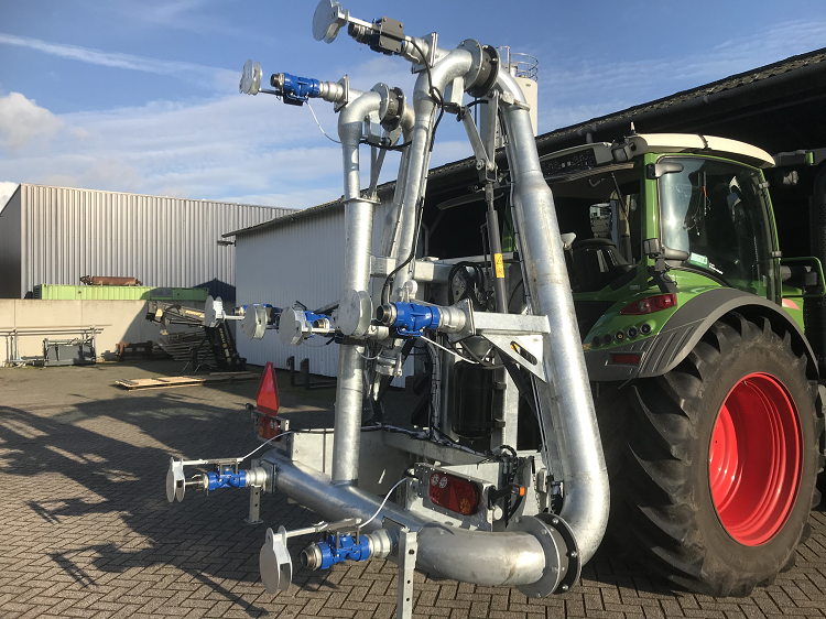 Resultaat is een hydraulisch inklapbare boom met acht sproeikoppen, die elk een eigen pneumatische afsluiting voor sectiecontrole hebben. “De aflaatklep komt van een haspel. De draaikrans van Kramp. Het volgordeklepje met kogelkraantje gebruiken we van een Krone-schudder. Het buizenframe hebben we zelf gelast. Het opklapmechanisme hebben we bij Joskin besteld.” De boom is voorzien van een aansturingkast. “Het geheel is door een extern bureau CE-gekeurd. Heel veel mechanisatie bedrijven bouwen wel, maar over CE-normering wordt niet nagedacht.” De zelfbouwboom voldoet ook aan de wegenverkeerswet en Lathouwers heeft zelf een handleiding geschreven.
