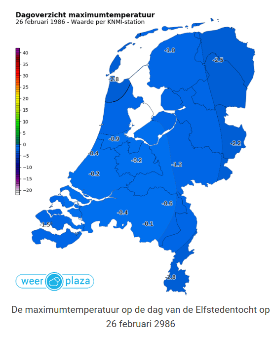 Het weer op 26 februari 1986 kan ook anders. Vandaag 33 jaar geleden stonden we massaal op de schaats en werd ook de veertiende Elfstedentocht verreden. Ook vorig jaar was het rond deze tijd opvallend koud met maximumtemperaturen iets boven nul wat het begin was van een korte periode met schaatspret.