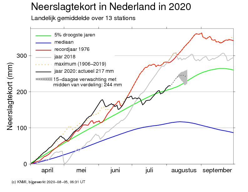 Als we kijken naar het neerslagtekort in Nederland dat zit hij momenteel weer boven de grens van de 5% droogste jaren in Nederland. Het jaar 2018 was natuurlijk ook een droog en warm jaar en liet in deze zelfde periode een daling zien. 2020 zal vanwege de aankomende hittegolf echter een fikse stijging laten zien. Hiermee volgt het de trend van 1976 op. In dit recordjaar was ook in deze periode tot eind augustus een flinke stijging te zien. Gaan we daar dit jaar ook weer heen of krijgen we eind augustus de gewenste neerslag?