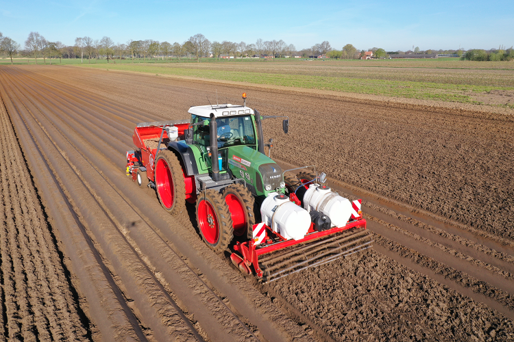 Berkers is hier enthousiast over. “Zo’n 6 a 7% van het areaal bestaat uit rijpad en het afsluiten van de vloeistofspuit als ook de granulaatstrooier levert een aanzienlijke besparing op”. Berkers spuit via het water Mirador (tegen Rhizoctonia), groeibevorderaar PhosN (Agrifirm) en vochtregulator Transformer (Agrifirm) mee in de rug via de spuitdoppen vlak voor aanaarden. Via de granulaatstrooier wordt Vydate (tegen aaltjes, luizen en coloradokever) in de rug gestrooid.