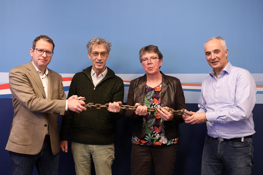 Op de foto ziet u van links naar rechts: André Hoogendijk (BO Akkerbouw), Henk Klompe (Bionext), Tineke de Vries (LTO Nederland) en Geert Kessel (WUR). De keten symboliseert de ketenaanpak.