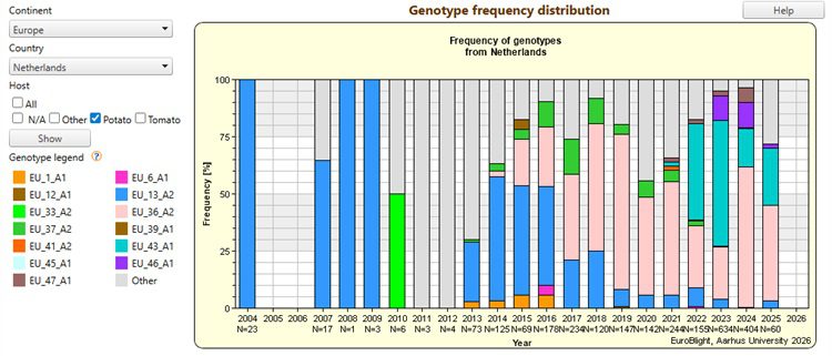 Hale toont grafieken van de verschillende phytophthora-stammen in de afgelopen jaren. De bekende EU-43 liet een piek zien in 2023, gevolgd door EU-46. Alterneren en combineren wisten deze phytophthora-stammen in 2024 en 2025 terug te dringen. Dankzij de gunstige weersomstandigheden bleef de ziektedruk laag in 2025.