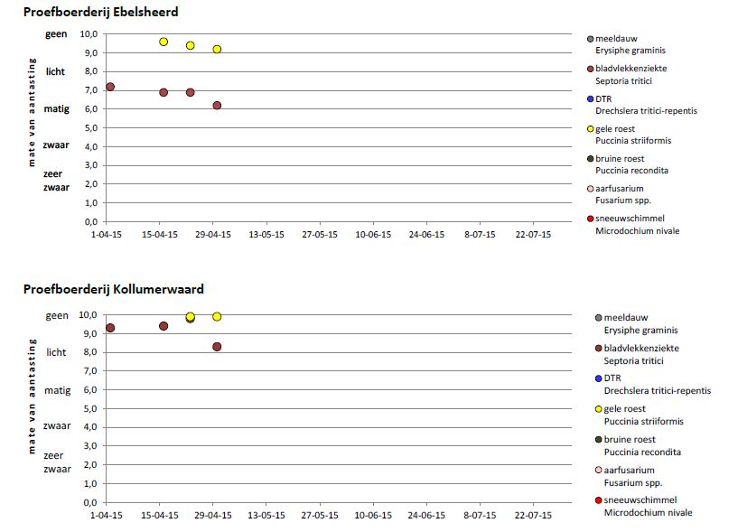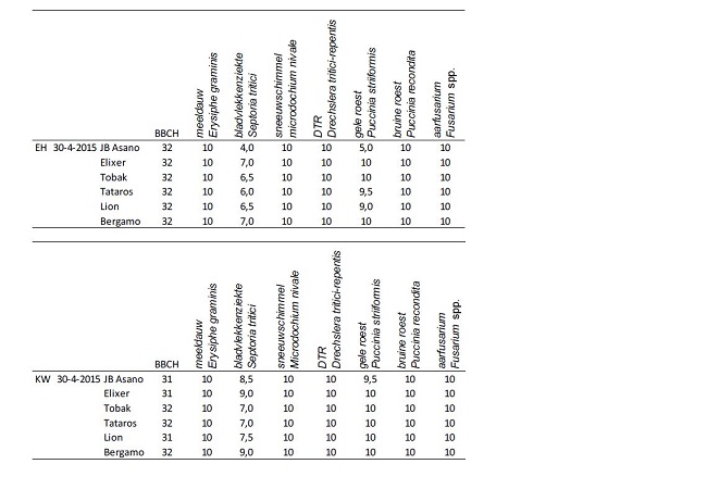De aantasting van gele roest op Ebelsheerd is gemiddeld iets toegenomen. Vooral in Asano is deze sterk gestegen. De septoria aantasting is door de regen van 3-4 weken geleden, op beide locaties sterk toegenomen. De pycnidiosporen (zwarte puntjes) zijn zeer duidelijk te zien. Met aanhoudend wisselvallig weer en hogere temperaturen zal de infectie verder toenemen, maar zal pas een aantal weken later te zien zijn. Nagenoeg alle rassen staan nu in het tweede knoop stadium.
