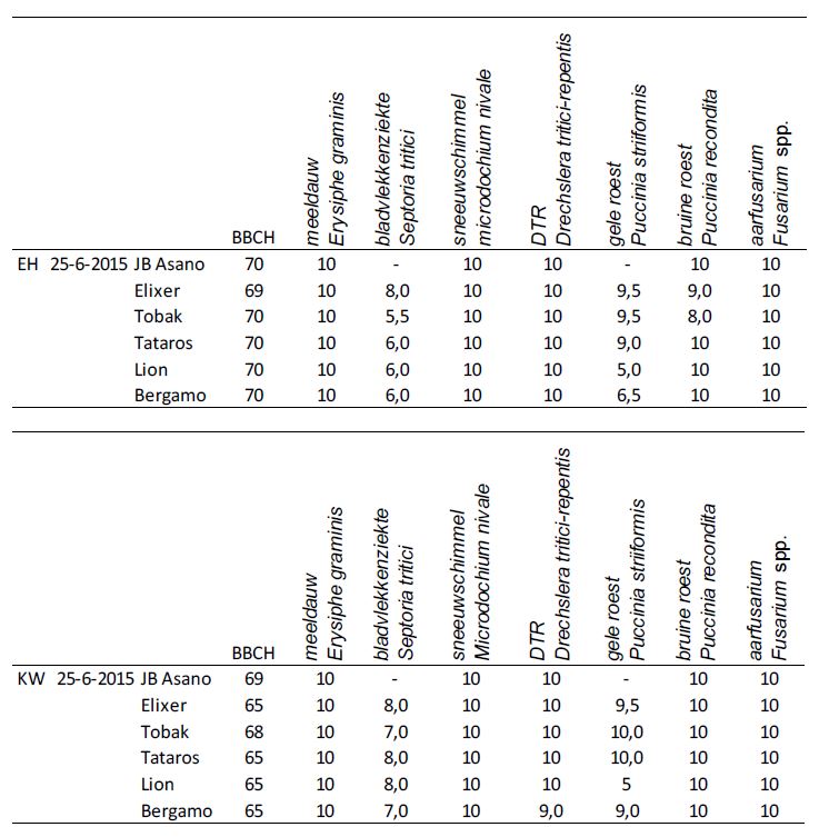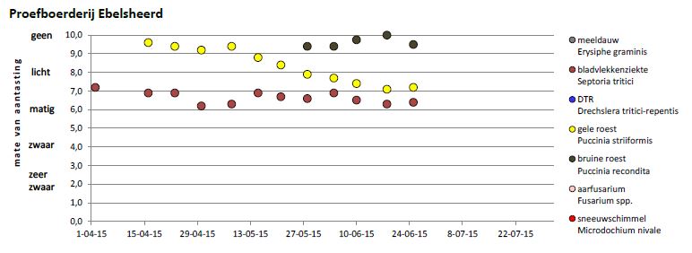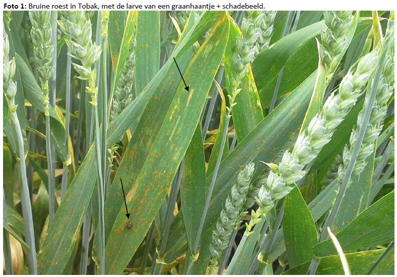 De aantastingen van gele roest en septoria is op beide locaties stabiel. Op Ebelsheerd is de aantasting van bruine roest weer terug. In Tobak en Elixer is een actieve haard waargenomen. Tevens is het graanhaantje redelijk actief. Het schadebeeld hiervan is te herkennen aan ‘geskeletteerde’ bladeren (witte strepen) in de lengterichting van de nerven.